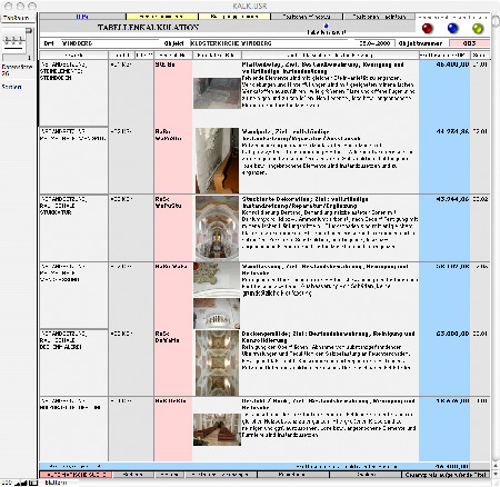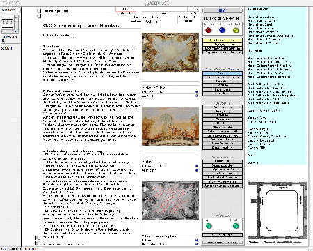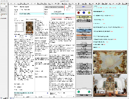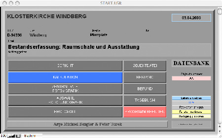 Die Erfahrung bei der freiberuflichen Projektbetreuung sowie bei der Dokumentation von restauratorischen Instandsetzungsleistungen haben gezeigt, daß eine Informationsaufbereitung mittels fachspezifischer Datenbank-Lösung bestmögliche Informationsweitergabe gewährleistet. Ziel der plattformunabhängigen Datenbankentwicklung war die Vorlage einer erweiterbaren Grundlagenermittlung in Form einer Bestandsdokumentation mit integrierter Inventarisation. Schriftliche, grafische und fotografische Untersuchungsergebnisse werden darin zusammengefasst, über Glossare strukturiert und im Zuge weiterführender Inhalte ergänzt. Grundsätzlich soll vermieden werden, daß die Projektdokumentation in separate Grundlagendokumentationen, fachplanerische Abstimmungen und abgekoppelte Massnahmendokumentationen zerfällt. Mittels Datenbankstruktur, können die aktuellen Dokumentationsergebnisse bereits im Vorprojekt systematisch gebündelt, fachplanerisch weiterbearbeitet und ggf. an das nächst betroffene Instandsetzungsgewerk weitergeleitet werden. Abfragen über zu erbringende Inhalte bzw. fachtechnische Defizite der Dokumentationsleistung werden hierüber erleichtert, eine zusammenhängende Baudokumentation der Voruntersuchungsergebnisse und Instandsetzungsleistungen ist gewährleistet. Die notwendige Erfassungsdichte der Informationen wird im Zuge der Bearbeitung stetig rekapituliert und gestrafft. Parallel hierzu hat sich die vorgezogene, fotografische Grundlagenermittlung mit hochauflösender Digitalfotografie bewährt, die Ergebnisse fliessen direkt in die digitale Datenbank ein (Stichwort: Kostensenkung). Erst nach Abschluss und Auswertung der Grundlagenermittlung wird eine spezifische Fotoauswahl, bauhistorisch bedeutender Motive festgelegt, welche in analoger Form (Diapositiv/sw-Negativ - Kleinbild- bzw. Mittelformat) professionell dokumentiert werden.