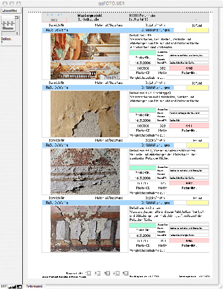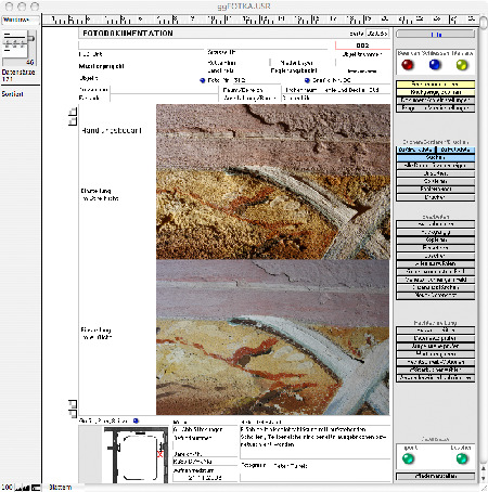 - Objekterfassung - Foto-, Grafik- und Filmdatei (QuickTime) mit Glossar- und Listendarstellung - Befundprotokolle - Probenahmeprotokoll - Arbeitsbericht - Präsentation ausgewählter Fotos und Grafik - Protokolldatei - Bautagebuch - Kalkulation, Grunddatenerfassung für Ausführungsleistungen - Bestandserfassung - Maske für Fotokarton, Träger für Prints und sw Abzüge